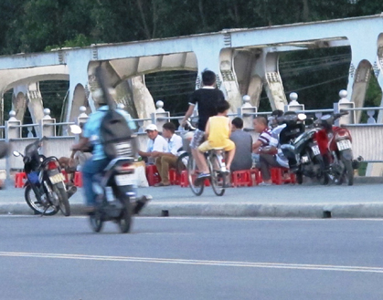 19 giờ 30 ngày 6/6 “hoạt động” mua bán trên hai bên lề cầu khá nhộn nhịp. Đi một lượt cả hai bên lề cầu, chúng tôi nhẩm đếm có khoảng 15 “quán”. Có những “quán” còn trưng tấm biển hiệu đề: “giải khát - trà chanh - nước sâm”, “cà phê cóc”, “cà phê - giải khát - bia lạnh”. Những tấm biển này phần lớn được dựng sát bàn hoặc xe đựng hàng, nhưng có tấm lại được ngang nhiên treo trên cột đèn đường.