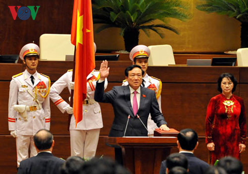 “Dưới cờ đỏ sao vàng thiêng liêng của Tổ quốc, trước Quốc hội, và đồng bào cử tri cả nước, tôi – Chánh án Toà án Nhân dân Tối cao nước CHXHCN Việt Nam tuyên thệ: Tuyệt đối trung thành với Tổ quốc, với Nhân dân, với Hiến pháp nước CHXHCN Việt Nam; hoàn thành tốt nhiệm vụ được Đảng, Nhà nước và Nhân dân giao phó” - Chánh án Nguyễn Hoà Bình tuyên thệ.