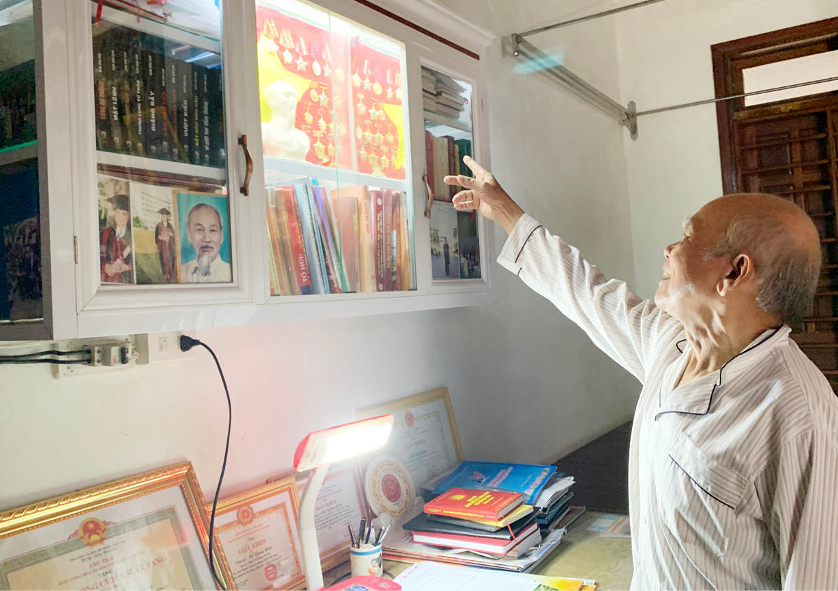 Cựu chiến binh Hồ Trọng Kình giới thiệu tủ huân chương của mình