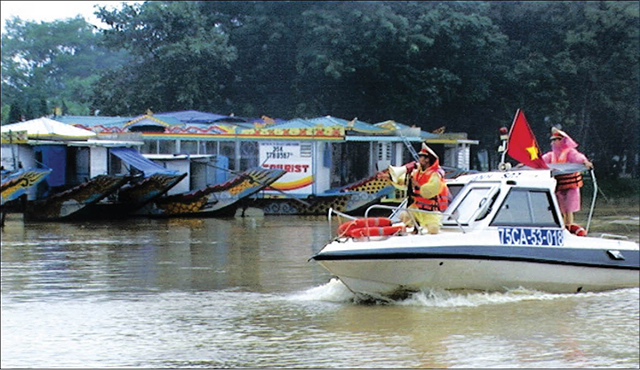 Cảnh sát đường thủy tuyên truyền người dân phòng chống bão lụt trên sông Hương Ảnh: Thái Bình