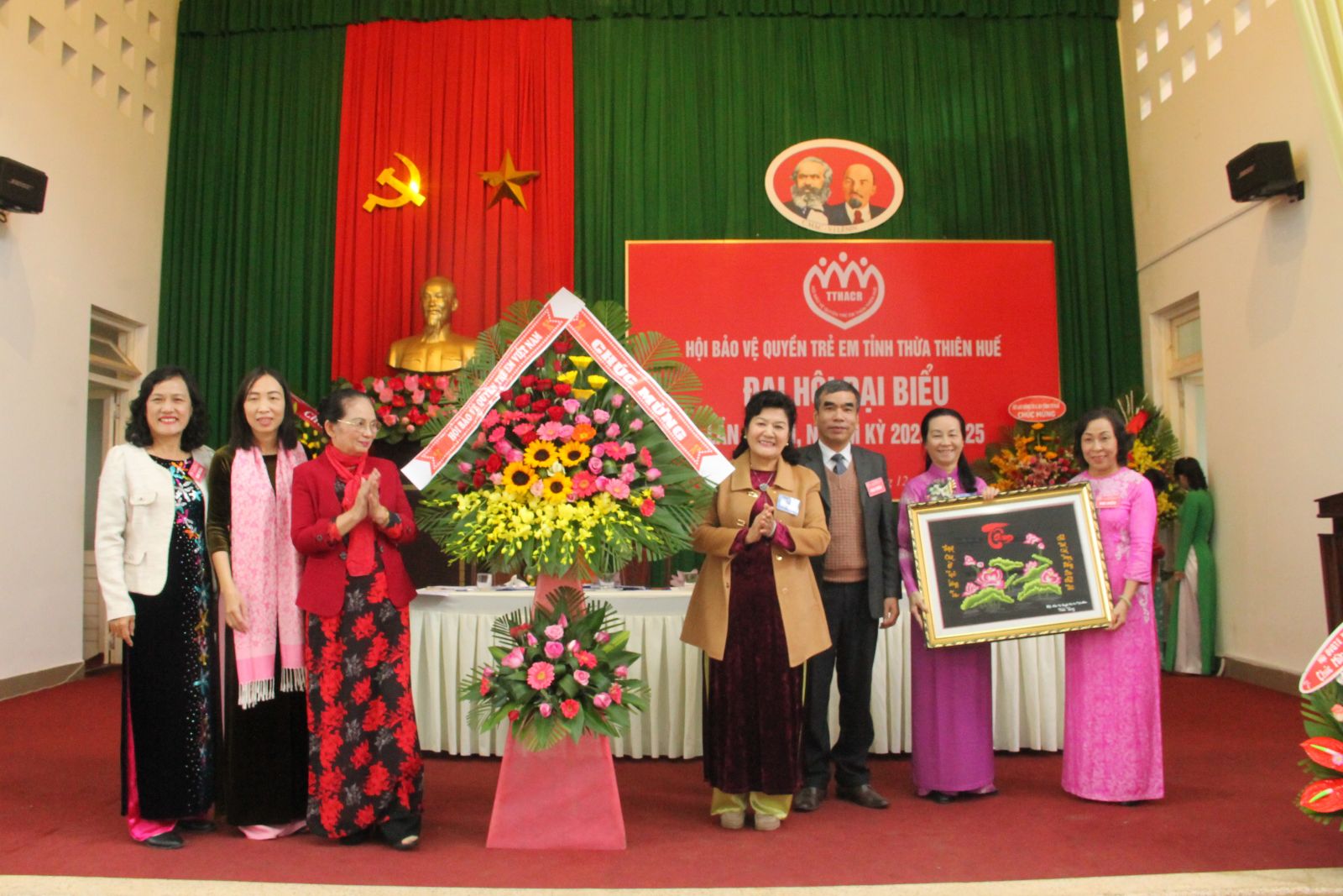 Bà Ninh Thị Hồng, Phó Chủ tịch Hội BVQTE Việt Nam (thứ tư, phải sang) tặng hoa chúc mừng đại hội