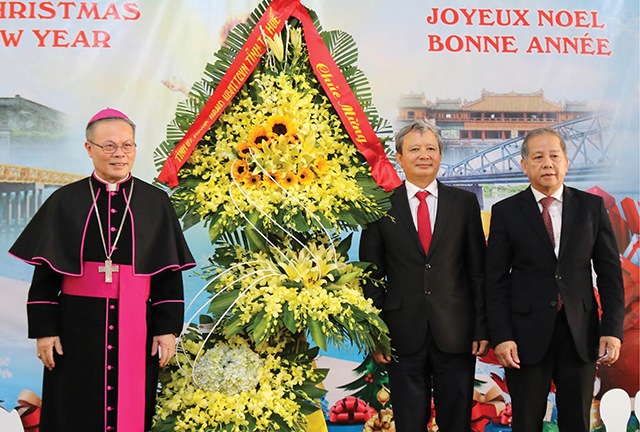 Bí thư Tỉnh ủy Lê Trường Lưu và Chủ tịch UBND Phan Ngọc Thọ (bên phải) tặng hoa chúc mừng Tòa Tổng Giám mục dịp Giáng sinh 2019