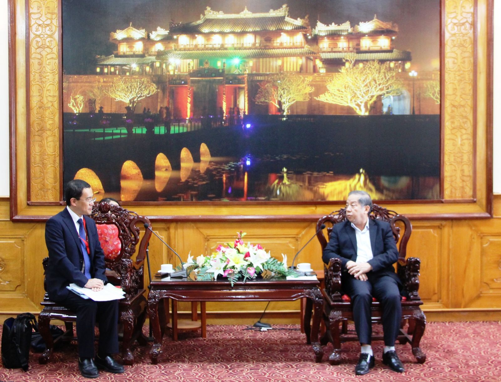 Phó Chủ tịch Thường trực UBND tỉnh Phan Ngọc Thọ (bên phải) tiếp cố vấn cao cấp chương trình tình nguyện viên JICA