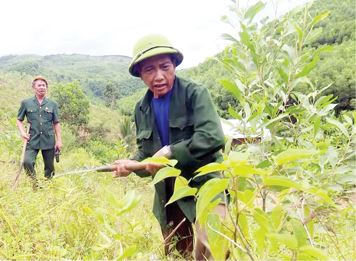 Cựu chiến binh Nguyễn Văn Chức chăm sóc rừng keo tràm mới