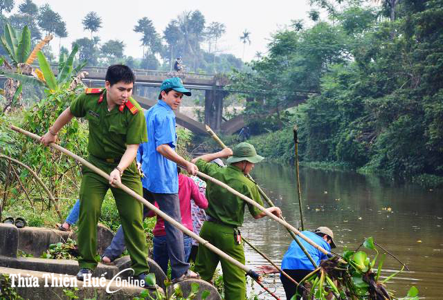 Công an TX. Hương Trà tham gia cùng người dân vớt bèo làm sạch môi trường