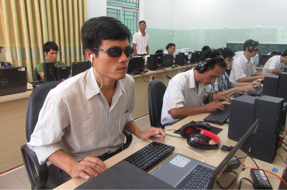 Ông Lê Văn Lộc, Chủ tịch Hội Người mù (HNM) tỉnh, cho biết: “Năm 2017, Tổ chức JICA – Nhật Bản đã tài trợ 13 bộ máy tính xách tay cài đặt phần mềm dành cho người mù, 3 máy in chữ Braille. Được sự quan tâm của các cấp ngành, phòng dạy tin học cũng đã nâng cấp, cải tạo và phục vụ đắc lực cho việc mở lớp tin học dành cho người mù”.