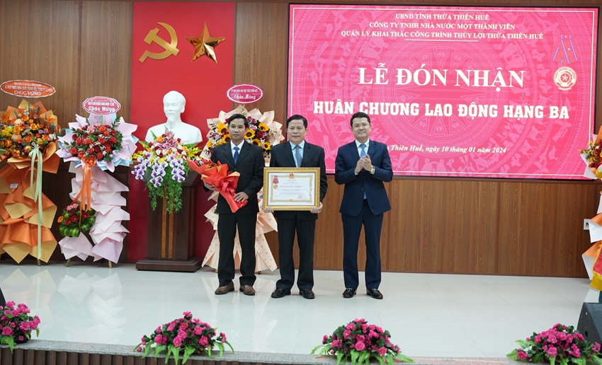 | Thừa ủy quyền Chủ tịch nước, Phó Chủ tịch UBND tỉnh Hoàng Hải Minh đã trao Huân chương Lao động hạng Ba cho Công ty Thủy Lợi |