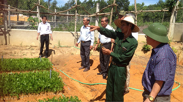 CCB Võ Văn Nghĩa (thứ 2 từ phải sang) đang giới thiệu về vườn ươm cây giống của mình ở xã Bình Thành (Hương Trà)