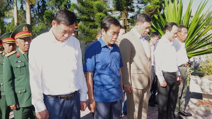Trước anh linh các anh hùng liệt sĩ, trong không khí trang nghiêm, thành kính, Thượng tướng, Phó Giáo sư, Tiến sĩ Trần Việt Khoa, Giám đốc Học viện Quốc phòng cùng Phó Bí thư Tỉnh uỷ, Chủ tịch UBND tỉnh Nguyễn Văn Phương và các thành viên đoàn công tác thành kính dâng hoa, dâng hương, dành phút mặc niệm để tri ân và tưởng nhớ công lao to lớn của các anh hùng liệt sĩ đã dâng hiến tuổi thanh xuân, không tiếc máu xương, anh dũng chiến đấu và hy sinh vì độc lập tự do của Tổ quốc, vì hạnh phúc của nhân dân. Các đại biểu đã đến từng phần mộ, nơi yên nghỉ của liệt sĩ để thắp hương bày tỏ lòng biết ơn trước sự hy sinh cao cả của các liệt sĩ.