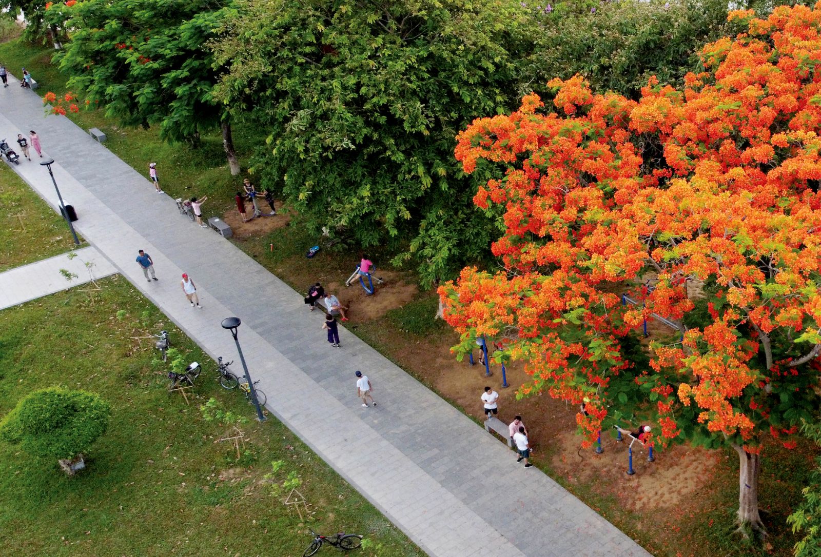 Người dân đi dạo trong không gian xanh ven sông Hương