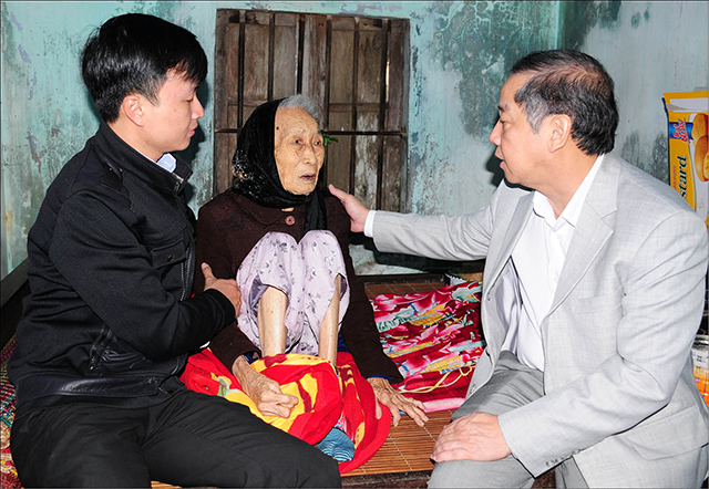 Ông Phan Ngọc Thọ (bìa phải) thăm mẹ Việt Nam Anh hùng tại huyện Quảng Điền