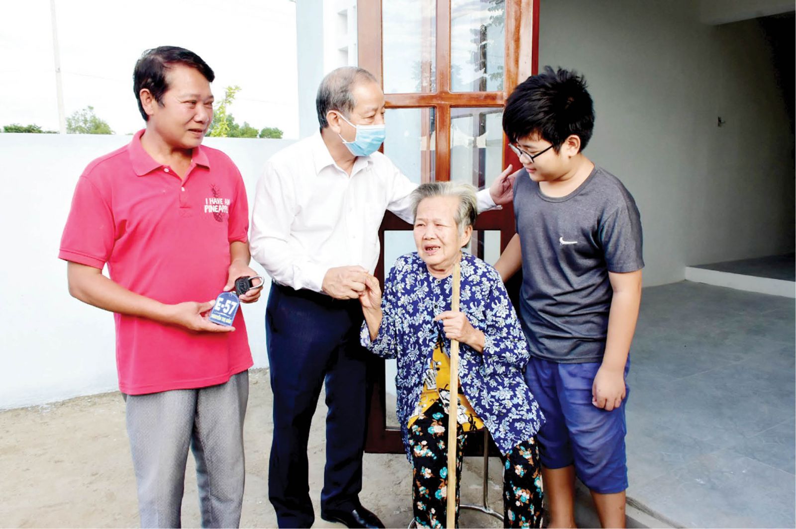 Phó Bí thư Thường trực Tỉnh ủy Phan Ngọc Thọ chia vui cùng gia đình hộ nghèo trong căn nhà mới ở khu tái định cư Hương Sơ (ảnh chụp trước thời điểm bùng phát dịch COVID-19). Ảnh: Thái Bình