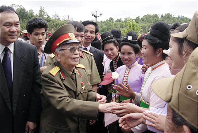 Cố Đại tướng Võ Nguyên Giáp nói chuyện, bắt tay đồng bào Điện Biên trong chuyến thăm Điện Biên Phủ nhân dịp kỷ niệm 50 năm chiến thắng lịch sử Điện Biên Phủ. Ảnh: Internet