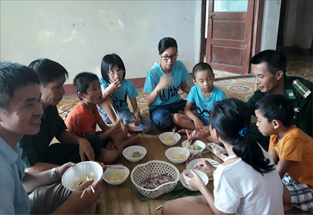 Các em nhỏ quây quần bên bữa cơm ấm áp với các chú BĐBP tại Trạm kiểm soát đảo Sơn Chà