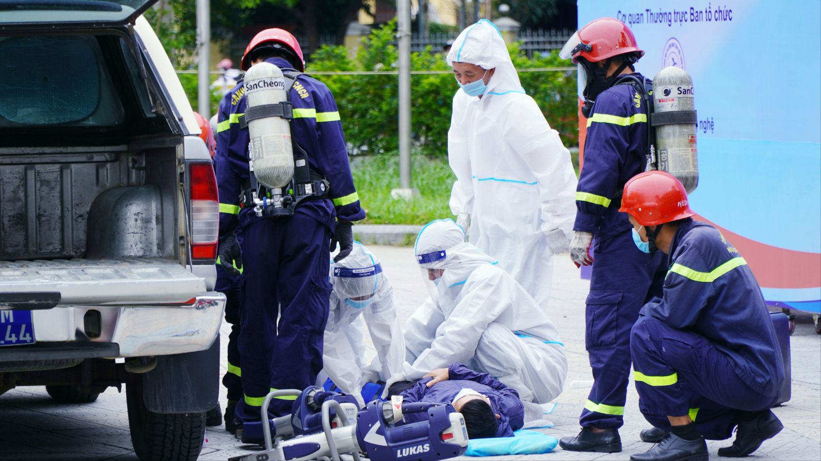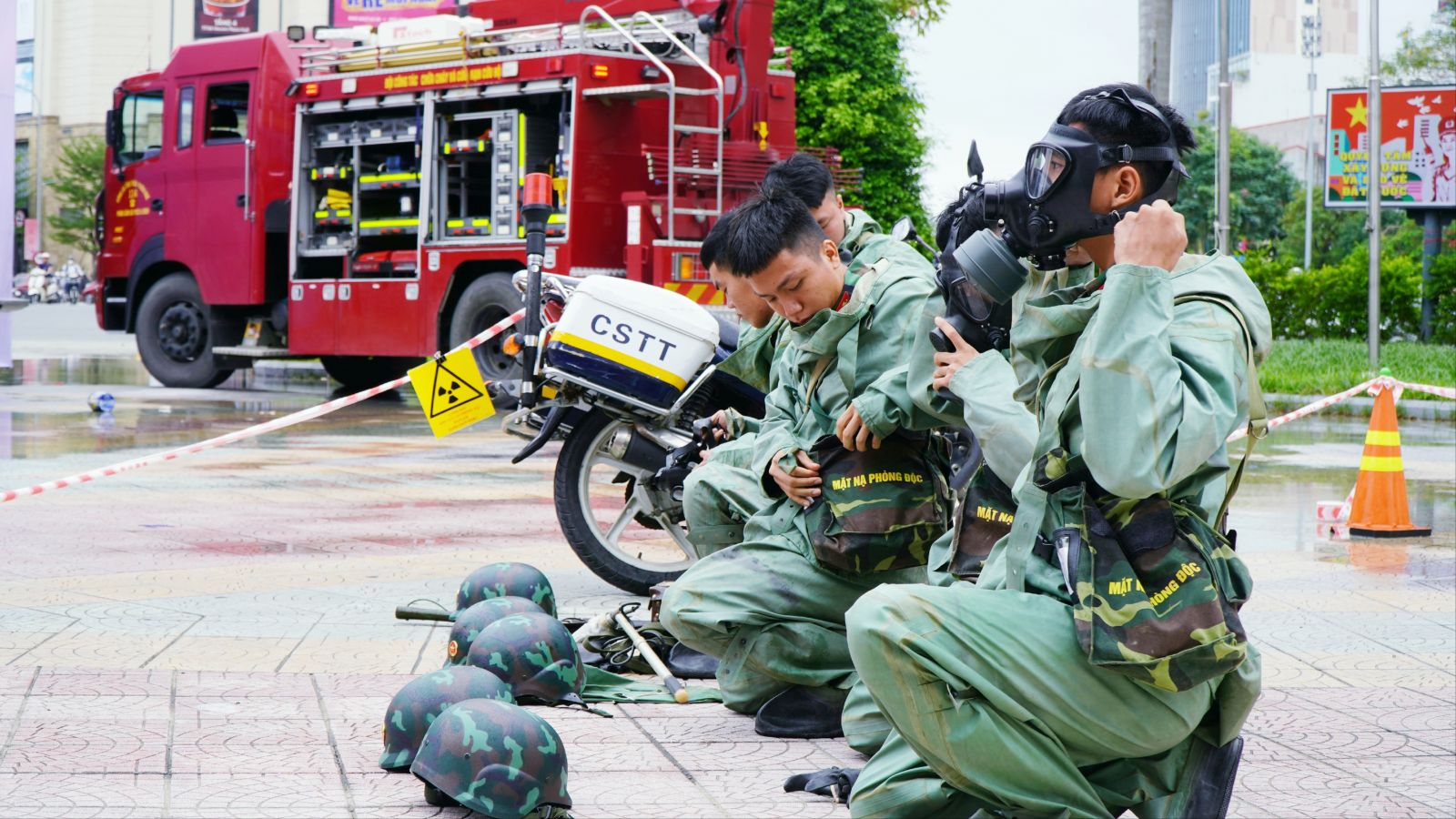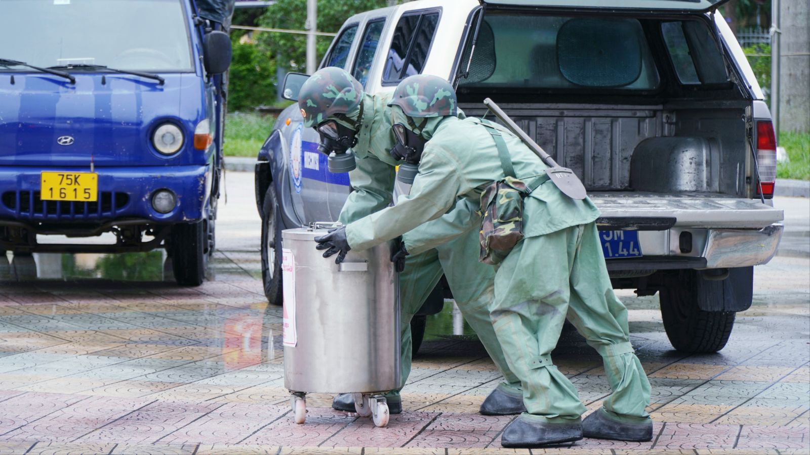 Lực lượng khác mặc bảo hộ chống độc tiếp cận hiện trường để đo, kiểm tra tình trạng nguồn phóng xạ