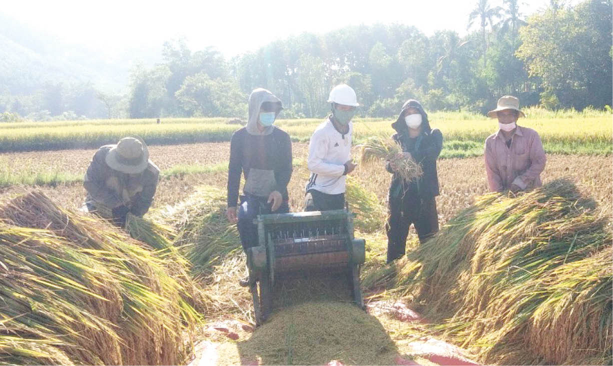 Đoàn viên, thanh niên Chi đoàn thôn Cha Ke hỗ trợ người dân địa phương thu hoạch lúa