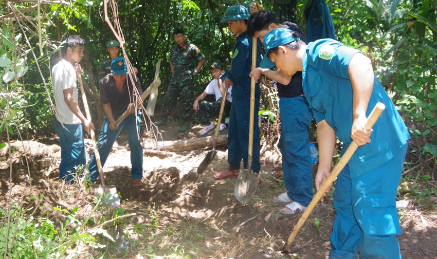 | Cán bộ, nhân viên Đội quy tập 192 Bộ và lực lượng dân quân huyện Phú Lộc mở rộng khu vực để tìm kiếm liệt sĩ |