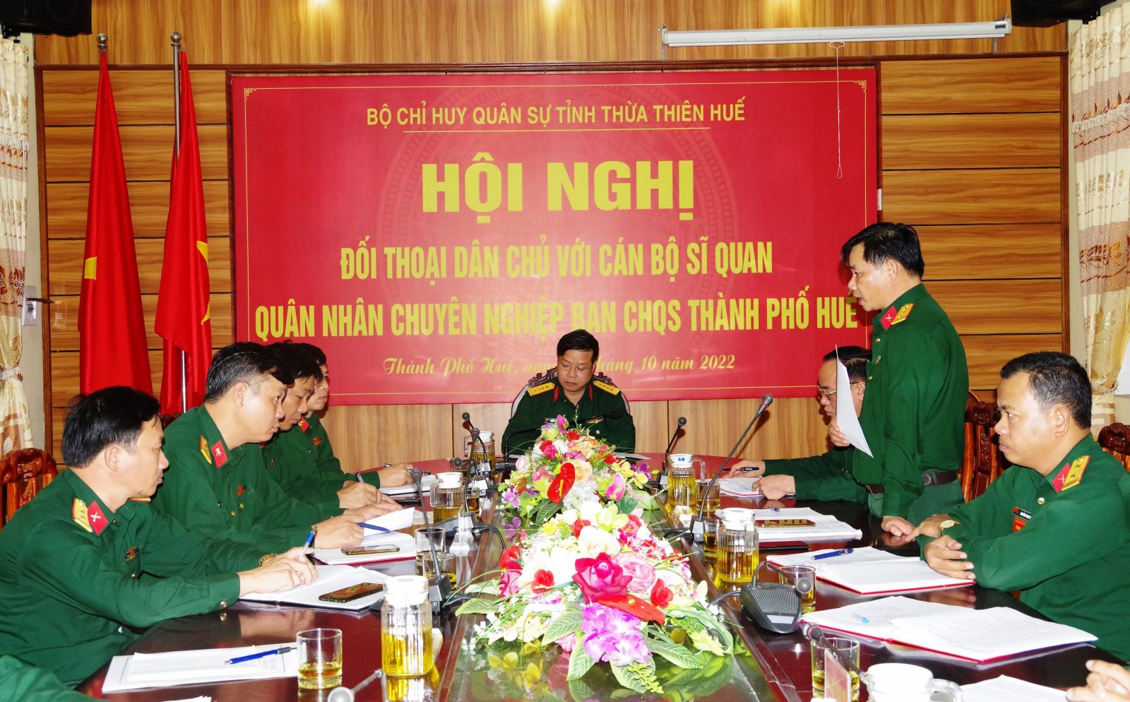 HNN.VN - Chiều 27/10, Đảng ủy, Bộ Chỉ huy Quấn sự (CHQS) tỉnh tổ chức đối thoại dân chủ với cán bộ, quân nhân chuyên nghiệp Ban CHQS Thành phố Huế. Đại tá Ngô Nam Cường – UVTV Tỉnh uỷ, Chỉ huy trưởng Bộ CHQS tỉnh chủ trì buổi đối thoại.