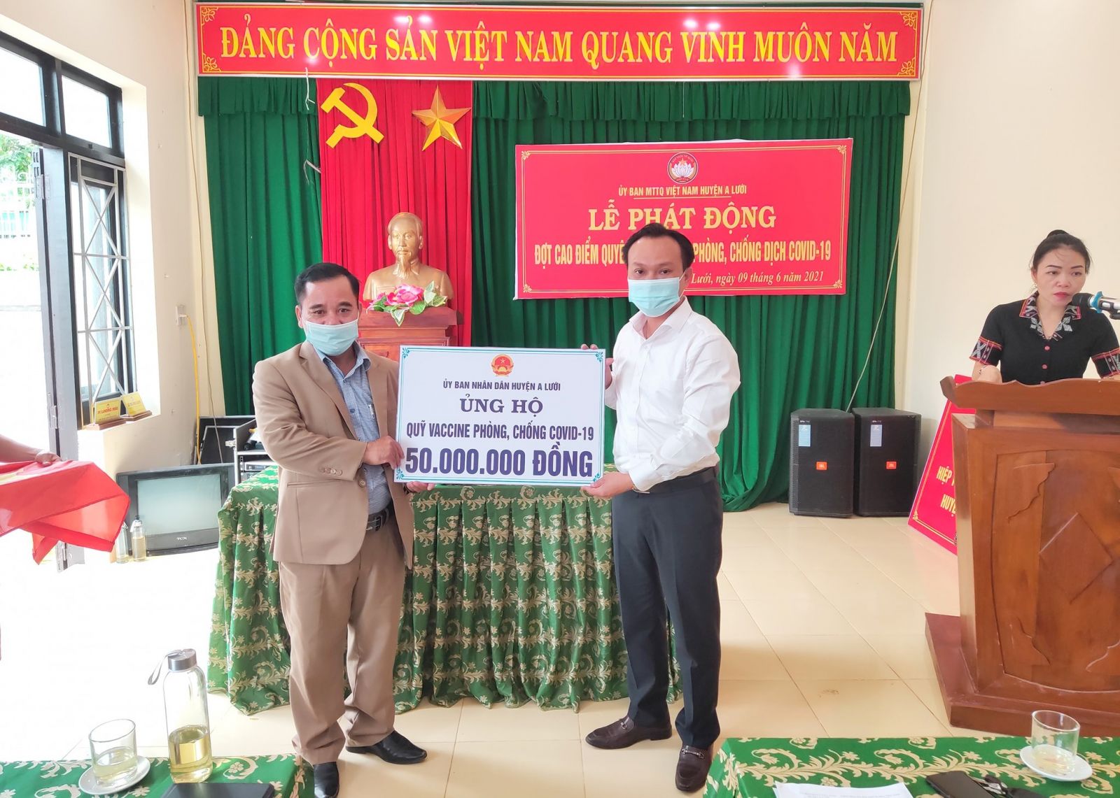 Ông Nguyễn Mạnh Hùng, Chủ tịch UBND huyện A Lưới trao tiền ủng hộ quỹ vắc xin phòng, chống dịch COVID-19