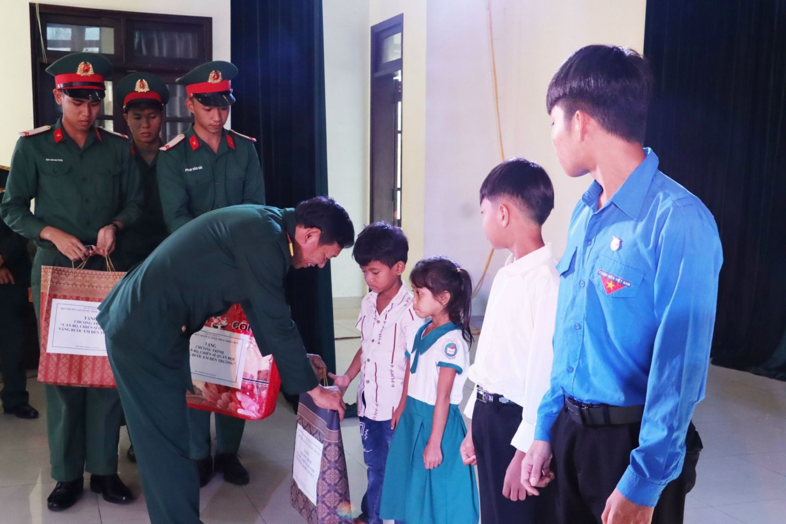 Lãnh đạo Bộ CHQS tỉnh tặng quà cho các em học sinh được nhận nuôi và hỗ trợ