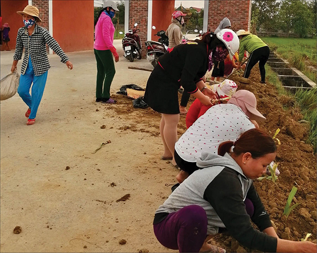 Hội viên Chi hội Phụ nữ thôn Dạ Lê dọn dẹp vệ sinh và trồng hoa tại “Tuyến đường sáng, xanh, sạch, trật tự trị an”