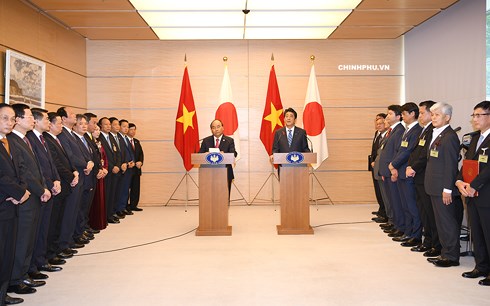 “Nhật Bản đang nghiên cứu xây dựng cơ chế mới về tiếp nhận nguồn nhân lực nước ngoài. Tôi sẽ tiếp tục đẩy mạnh đào tạo và thúc đẩy giao lưu nguồn nhân lực giữa hai nước thông qua Sáng kiến sức khỏe Châu Á và Sáng kiến về giáo dục tiếng Nhật mà tôi đưa ra năm ngoái. Đồng thời chúng ta nhất trí thực hiện các biện pháp xử lý các công ty môi giới và cơ sở tiếp nhận lao động Việt Nam sang Nhật Bản bất hợp pháp. Nhật Bản và Việt Nam là hai nước thúc đẩy mạnh mẽ thương mại tự do. Trong bối cảnh chủ nghĩa bảo hộ diễn ra trên thế giới, tôi và ngài Thủ tướng Nguyễn Xuân Phúc khẳng định với nhau việc tiếp tục đưa ra thông điệp mạnh mẽ về xúc tiến thương mại và đầu tư tự do và công bằng tới thế giới thông qua Hiệp định Đối tác toàn diện và tiến bộ xuyên Thái Bình Dương (CPTPP) và Hiệp định đối tác toàn diện khu vực (RCEP)”, Thủ tướng Shinzo Abe cho biết thêm.