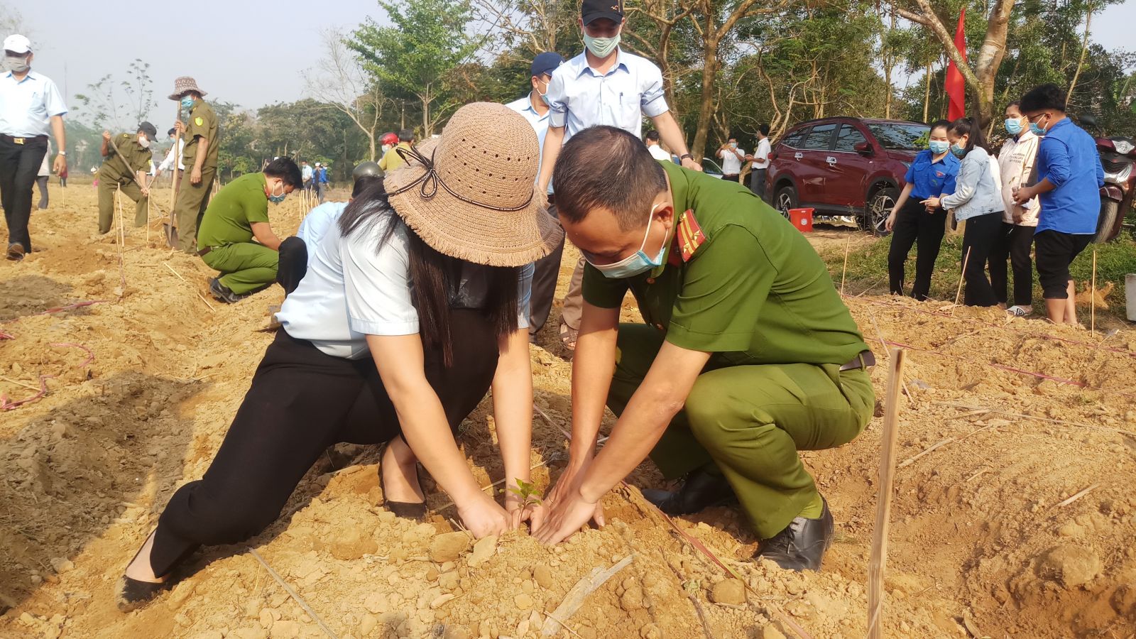 Lực lượng công an xã Phong Hòa cũng tham gia trồng mai vàng