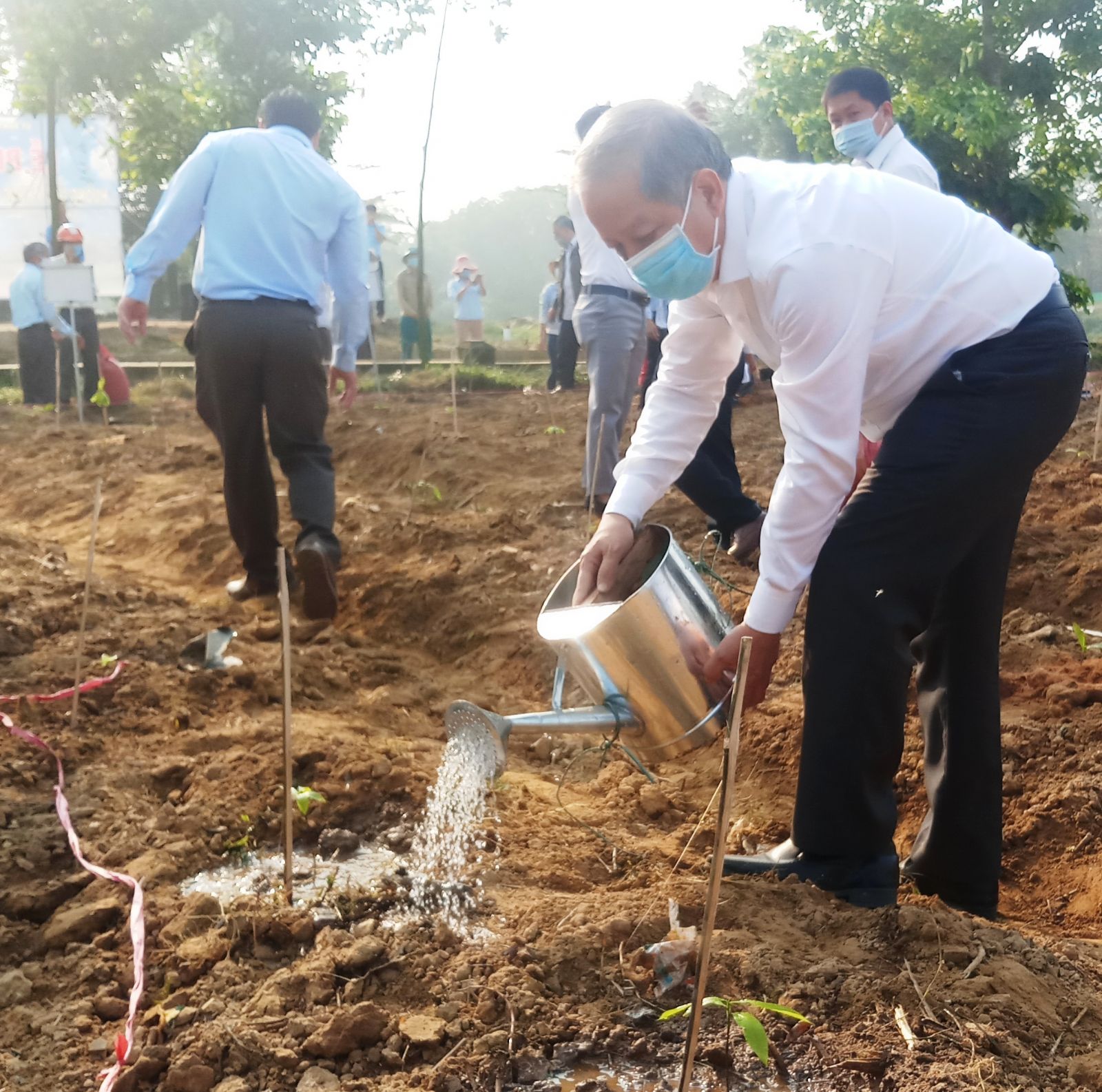 Sau khi trồng cây, Chủ tịch Phan Ngọc Thọ tưới nước cho cây mai vàng