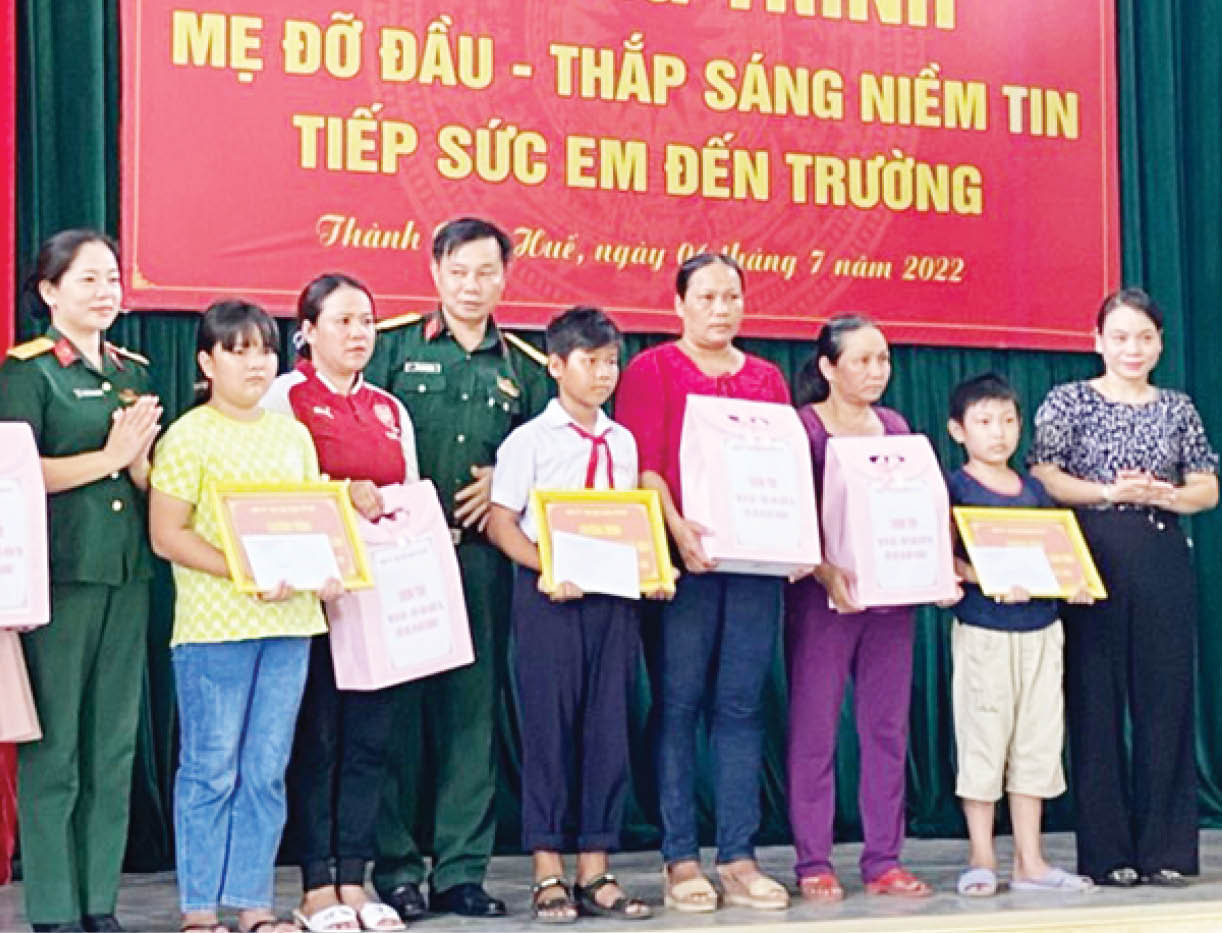 Thượng tá Trần Văn Thường, Chính trị viên, Ban CHQS TP. Huế cho biết: Chương trình “Mẹ đỡ đầu, Thắp sáng niềm tin, tiếp sức em đến trường” do Ban CHQS TP. Huế triển khai đã khảo sát và nhận đỡ đầu cho 4 học sinh, là những em bé mồ côi, có hoàn cảnh gia đình khó khăn trên địa bàn thành phố.