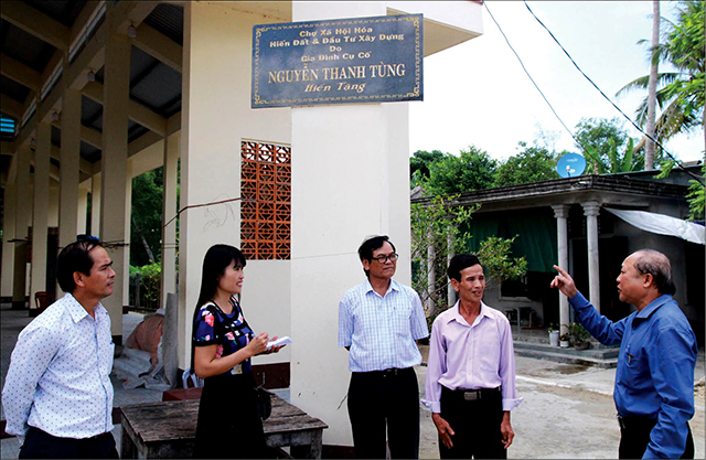 Bí thư Đảng ủy xã Vinh Xuân (ngoài cùng bên phải) giới thiệu về ngôi chợ trên địa bàn được người dân hiến đất và đóng góp toàn bộ kinh phí xây dựng