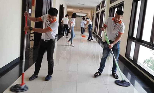 Học viên tại Trường Đào tạo Ngoại ngữ và Bồi dưỡng kiến thức Daystar vệ sinh trường học phòng dịch COVID-19. Ảnh: Daystar