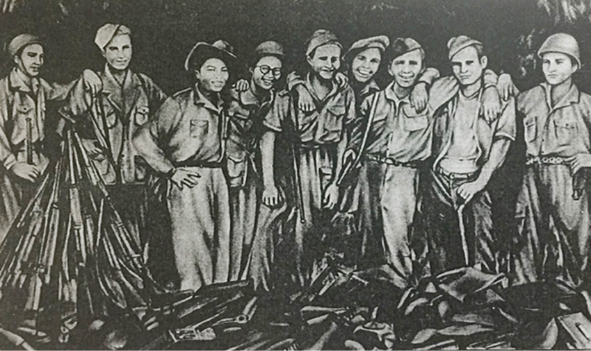 | Sau chiến thắng Hà Thanh ngày 9/7/1948: Từ trái sang: Chiến binh người nước ngoài (không biết tên), Paul Startre (Áo), Tiểu đoàn trưởng Bùi Ngọc Hoàng (sau này là Thiếu tướng mang tên Vương Tuấn Kiệt), Chính trị viên Tiểu đoàn Lê Đình Lý, Kémel (Đức), Lin (Đức), Roland (Đan Mạch), Julien (Ý), Tiểu đoàn phó Nguyễn Chí Hùng (Nhật) cùng chiến lợi phẩm thu được ở đồn Hà Thanh - Ảnh chụp tại Huyện ủy Phú Vang |