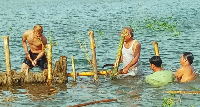 Cưa máy được sử dụng để cưa ngang phần tre nhô lên khỏi mặt nước