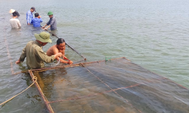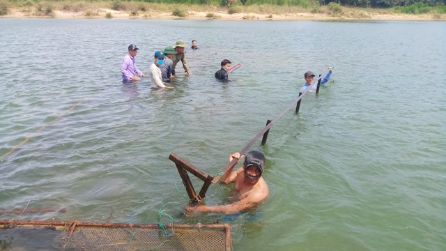 Tiếp đến, phải dùng cưa để cưa lồng sắt thành từng đoạn mới có thể đem vào bờ