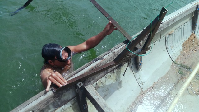 Phải lặn xuống mới có thể cưa phần đáy lồng