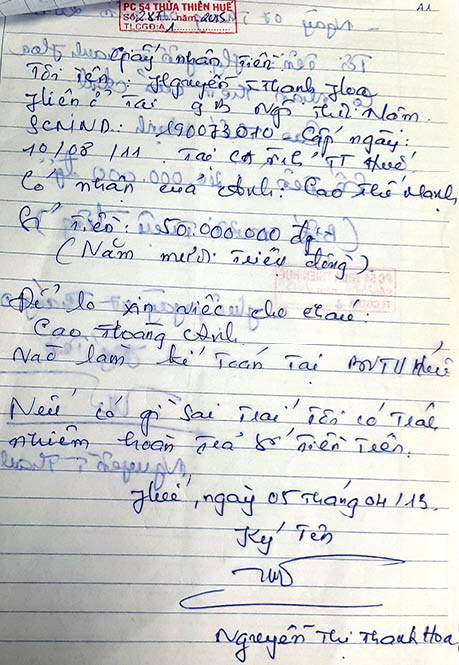 Một chứng từ thể hiện việc Hoa nhận tiền để chạy việc