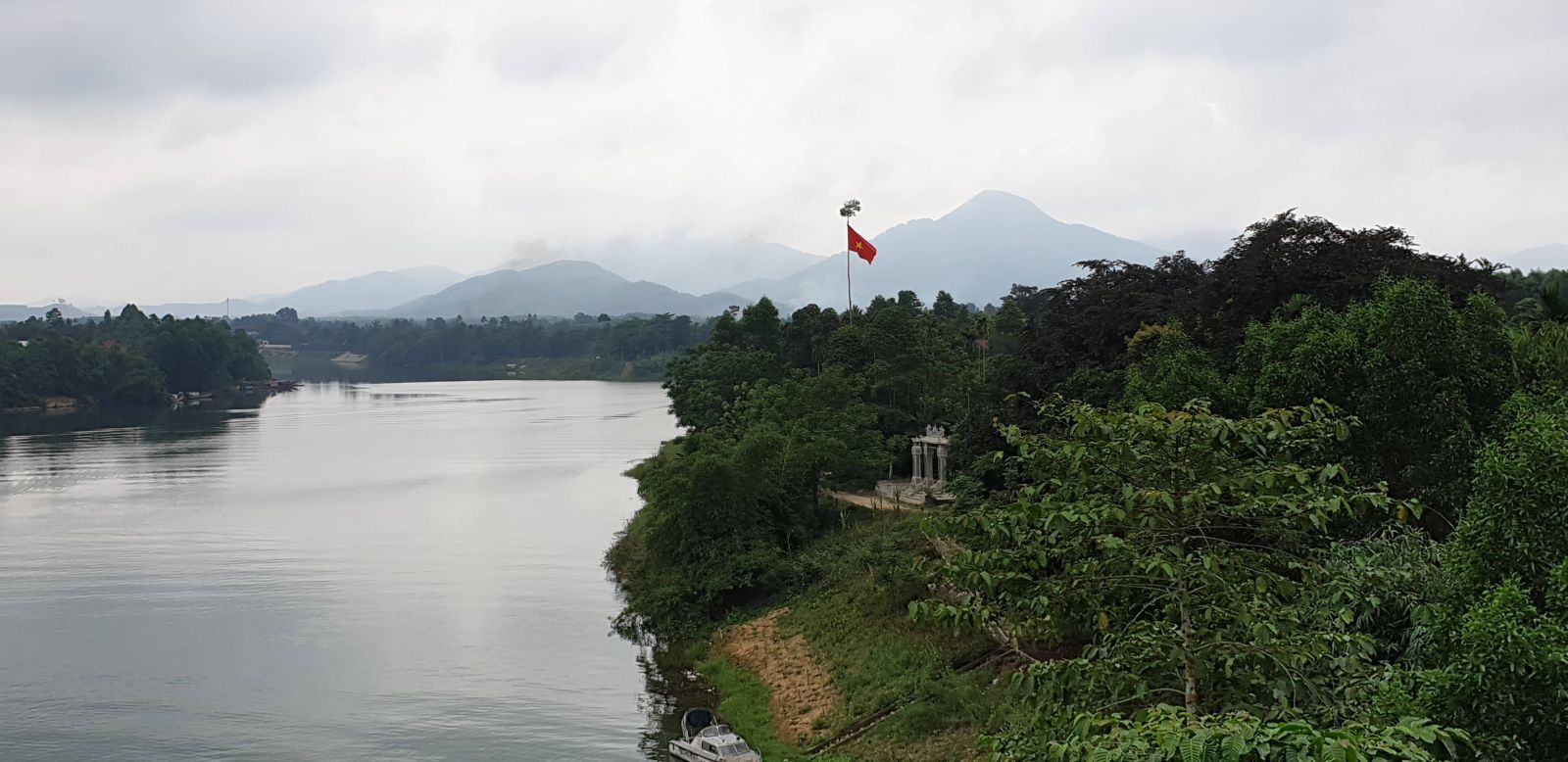 Cờ tổ quốc tung bay trên cây sến cao nhất xã (Ảnh chụp từ cầu Tuần)