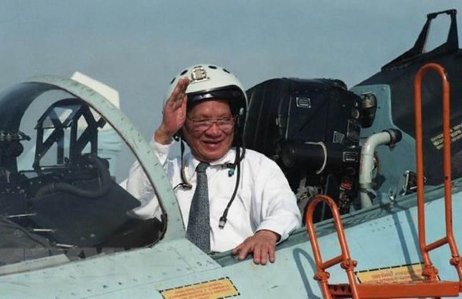 Chủ tịch nước Lê Đức Anh lên buồng lái máy bay chiến đấu Su-27 trong chuyến thăm Trung đoàn Không quân 937, Quân chủng Không quân Việt Nam, ngày 1/5/1996. Ảnh: TTXVN