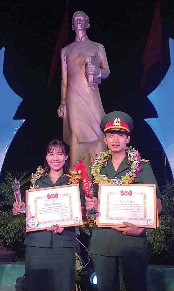 Đại úy Nguyễn Đình Trường (bên phải) nhận bằng khen trong Lễ tuyên dương Thanh niên tiên tiến làm theo lời Bác