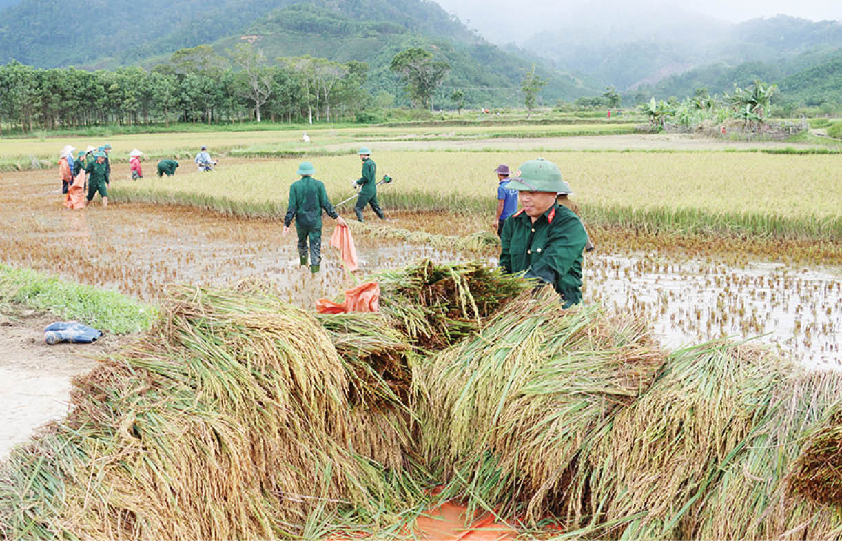 Cán bộ, chiến sĩ thu hoạch lúa cho bà con Nhân dân