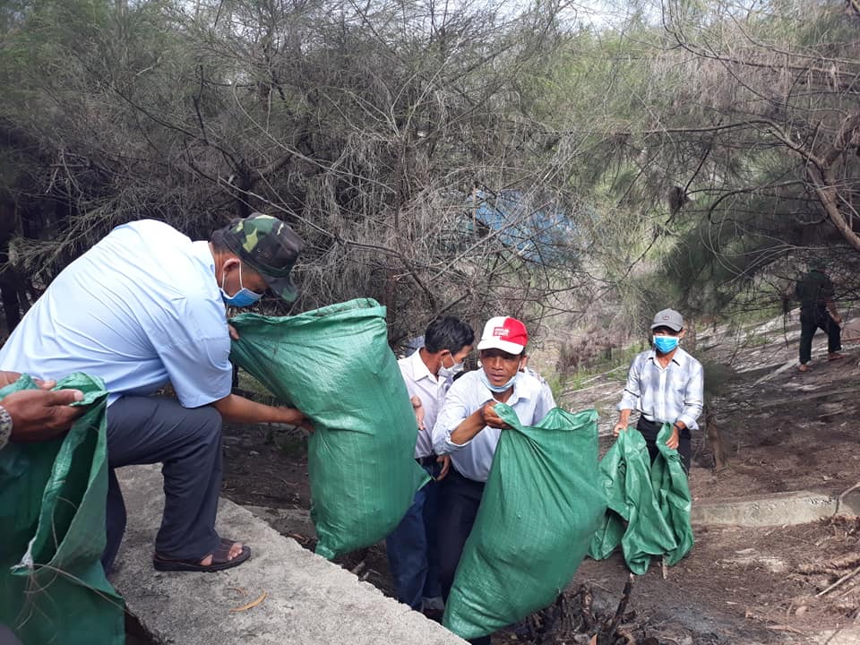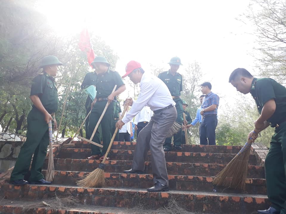 Lực lượng biên phòng đồn Vinh Xuân và cán bộ xã làm sạch khu vực tháp Chăm pa