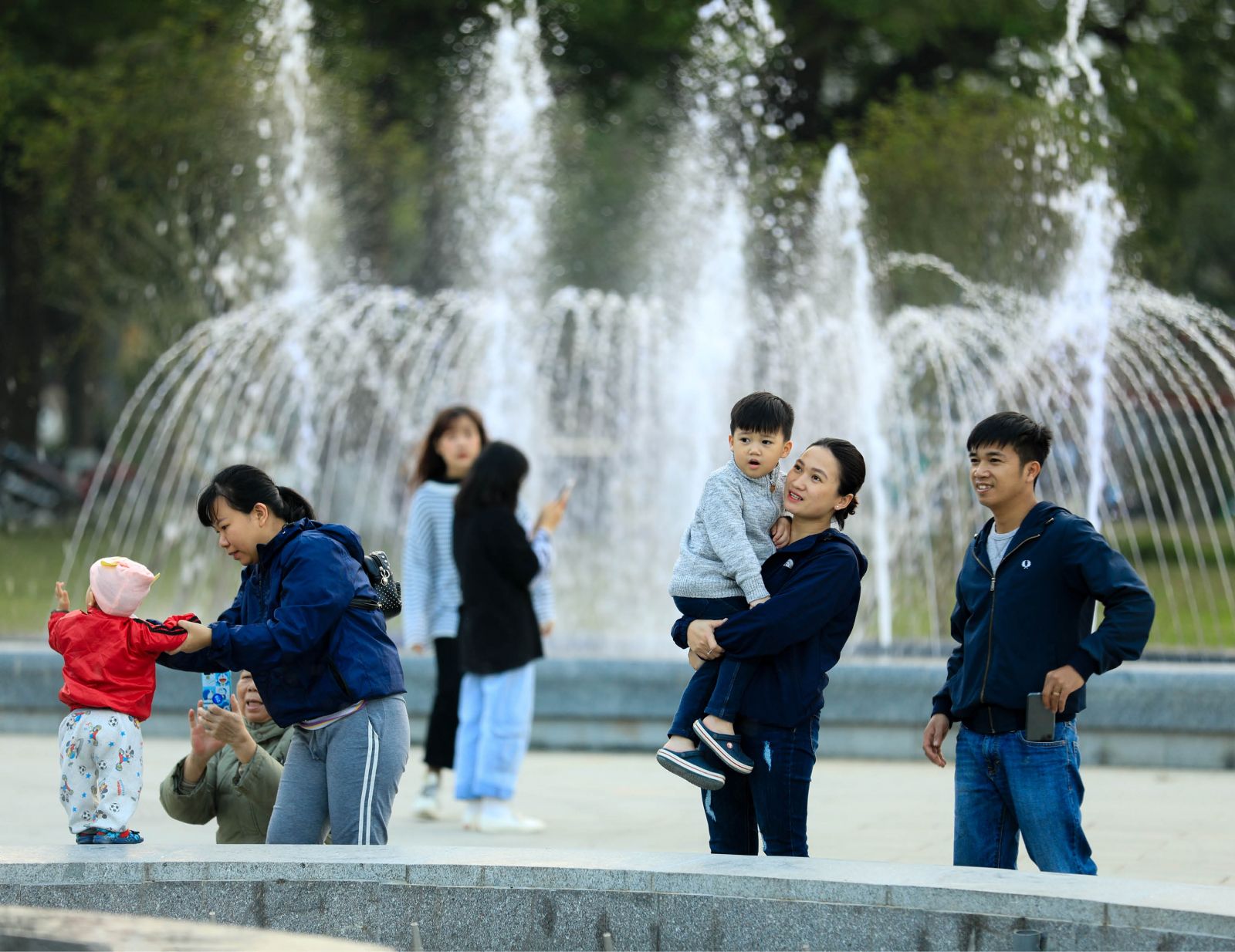 Đài phun  nước vừa đưa vào hoạt động thu hút đông đảo người dân đến vui chơi, chụp ảnh lưu niệm. Ảnh: NGUYỄN PHONG