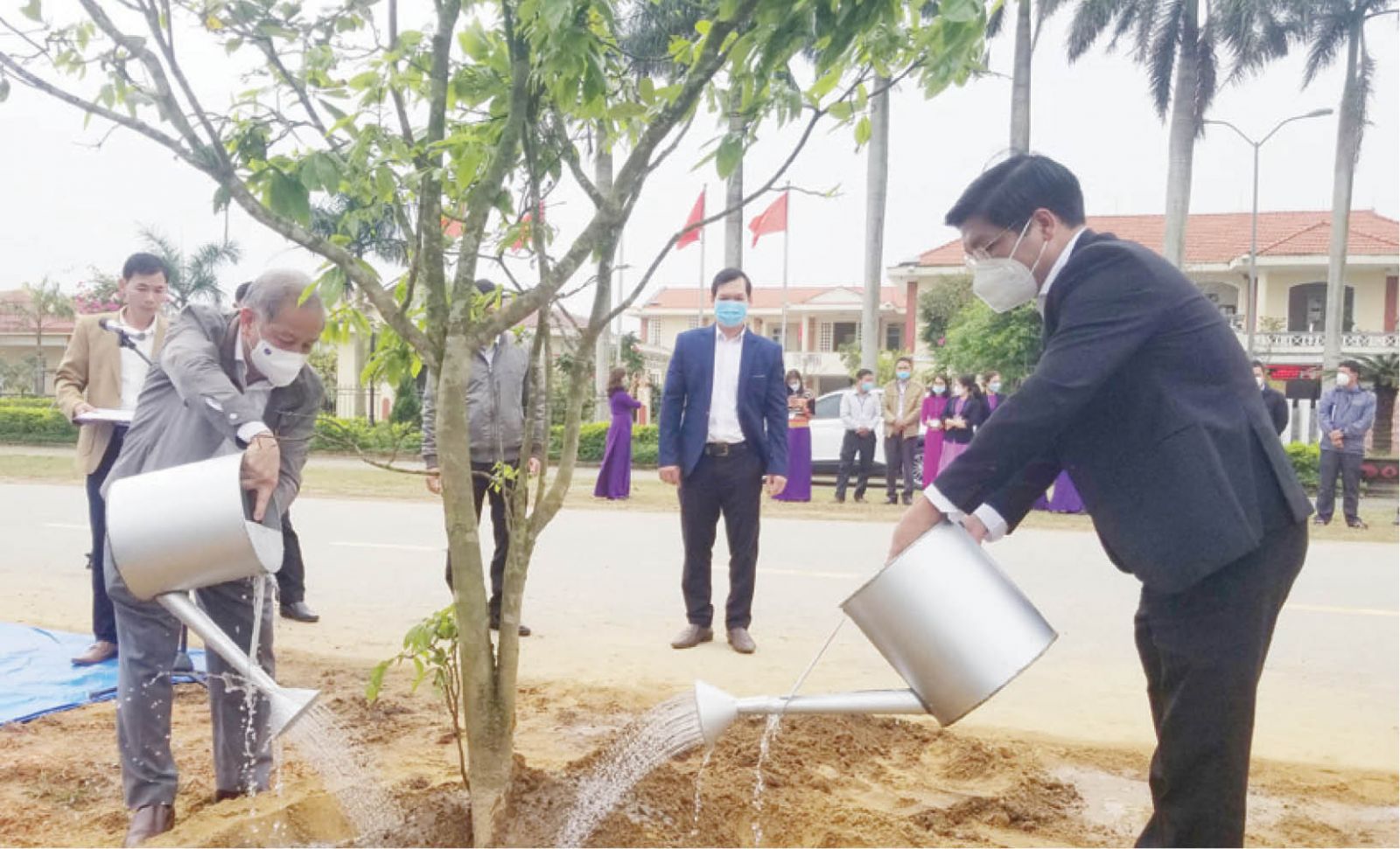 Phó Bí thư Thường trực Tỉnh ủy Phan Ngọc Thọ (bên trái) tham gia trồng mai vàng trên tuyến đường phía trước trụ sở UBND xã Quảng Thọ