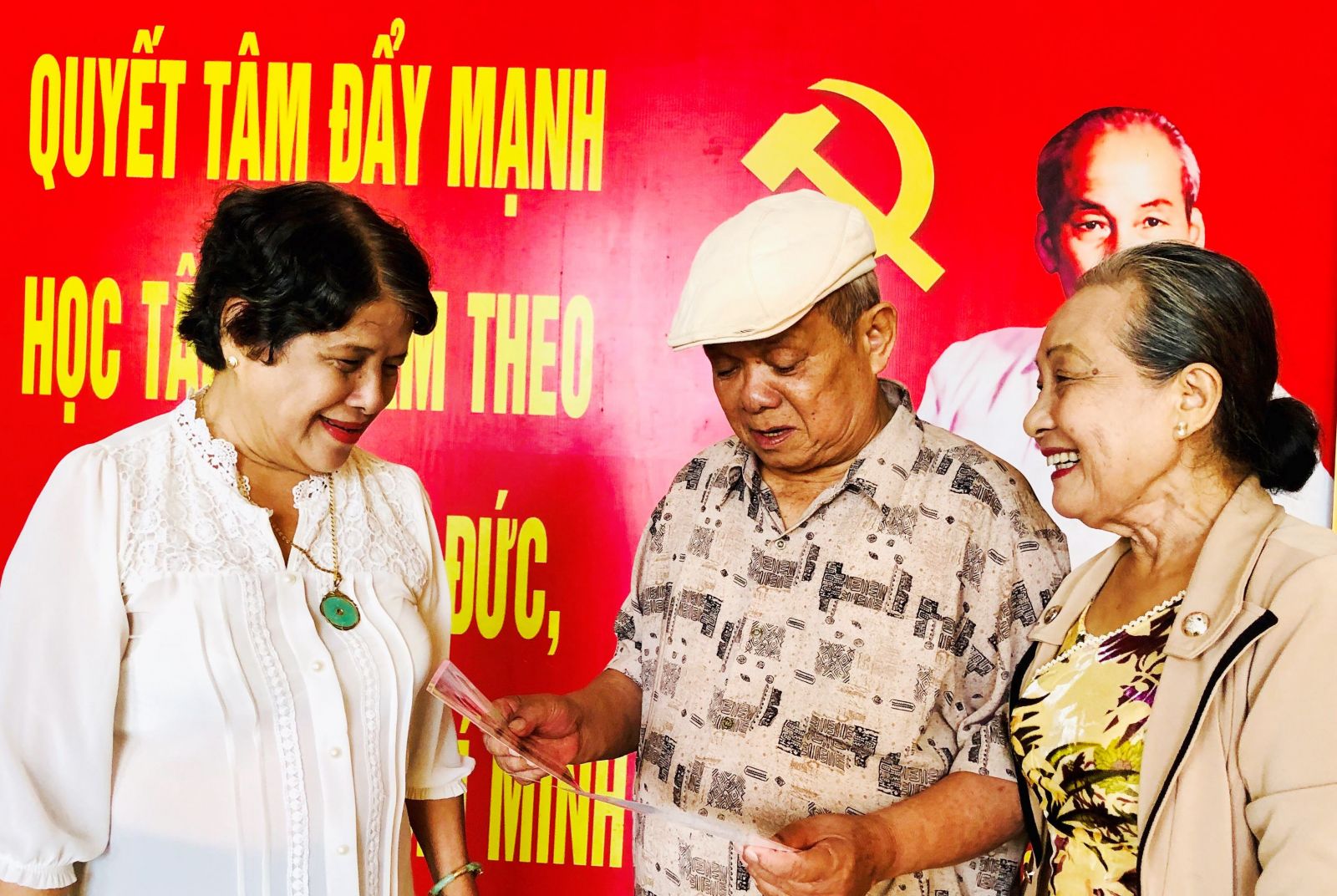 Ông Võ Nguyên Quảng (giữa) nguyên Phó Bí thư Tỉnh ủy, nguyên Trưởng đoàn ĐBQH tỉnh khóa IX ôn lại những kỷ niệm cùng các đồng chí, đồng đội tại buổi gặp mặt