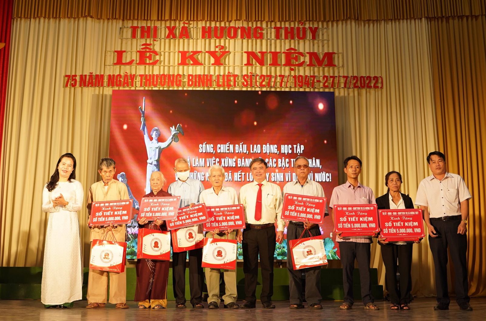 Cũng trong chương trình, TX. Hương Thủy dành tặng người có công cách mạng gặp hoàn cảnh khó khăn 20 sổ tiết kiệm, mỗi sổ 5 triệu đồng, trong đó, Thị ủy Hương Thủy: 1 sổ, Công đoàn cơ quan HĐND&UBND thị xã 4 sổ, Công an thị xã: 2 sổ, Ban CHQS thị xã: 1 sổ, Các cơ quan, đơn vị đóng trên địa bàn: 8 sổ, Công ty CP Dệt may Huế: 3 sổ, Công ty TNHH MTV Minh Đạt: 1 sổ và Tập đoàn Vingroup tặng 2 mẹ Việt Nam anh hùng 2 sổ tiết kiệm, mỗi sổ 5 triệu đồng.