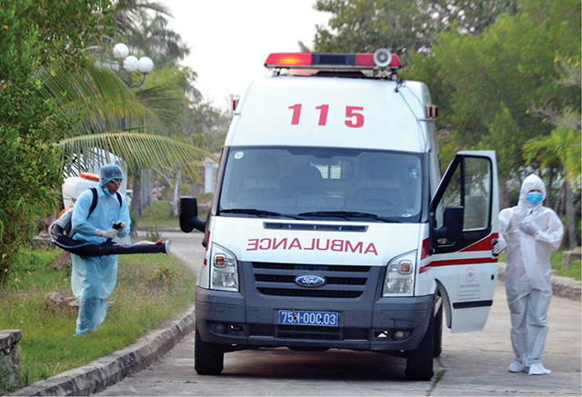 Sau ít phút, đoàn xe chuyên dụng (xe cứu thương) đưa 14 du khách về từ Khách sạn Moonlight.