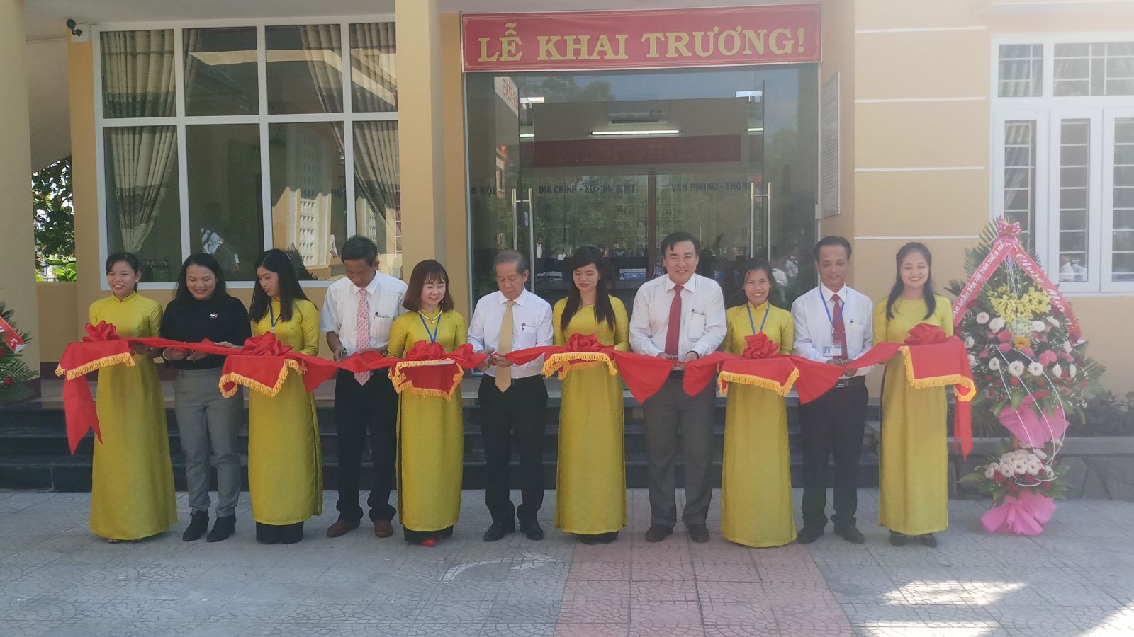 Ông Phan Ngọc Thọ, Chủ tịch UBND tỉnh và lãnh đạo huyện Phong Điền, xã Phong Bình cắt băng khánh thành bộ phận tiếp nhận và trả kết quả hiện đại xã Phong Bình