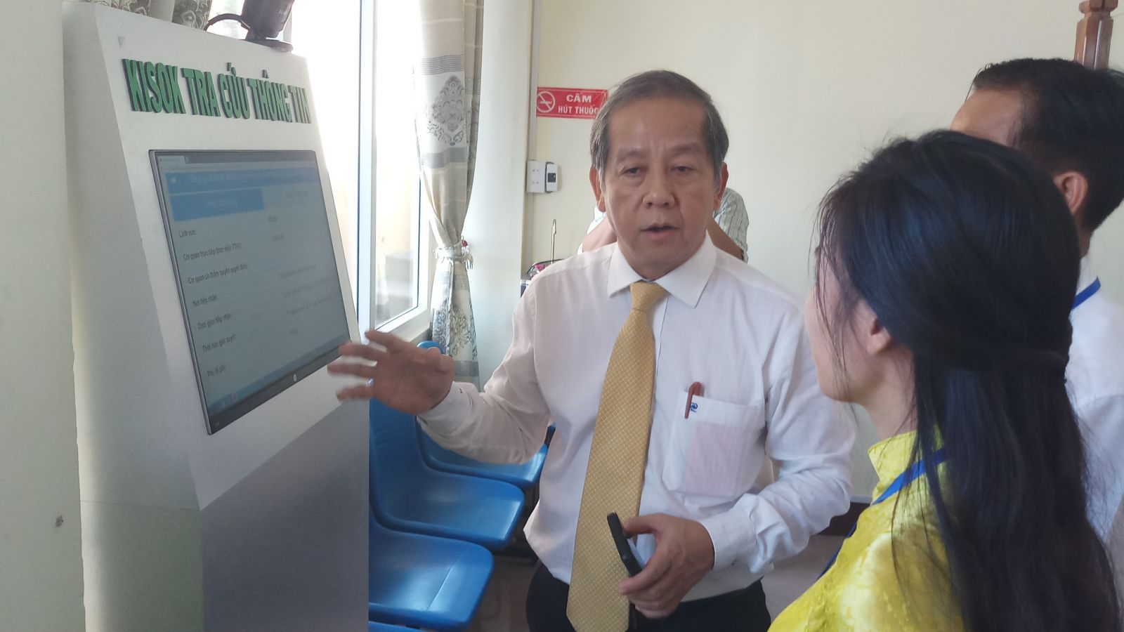Ông Phan Ngọc Thọ kiểm tra máy tra cứu thông tin tại Bộ phận tiếp nhận và trả kết quả hiện đại xã Phong Bình
