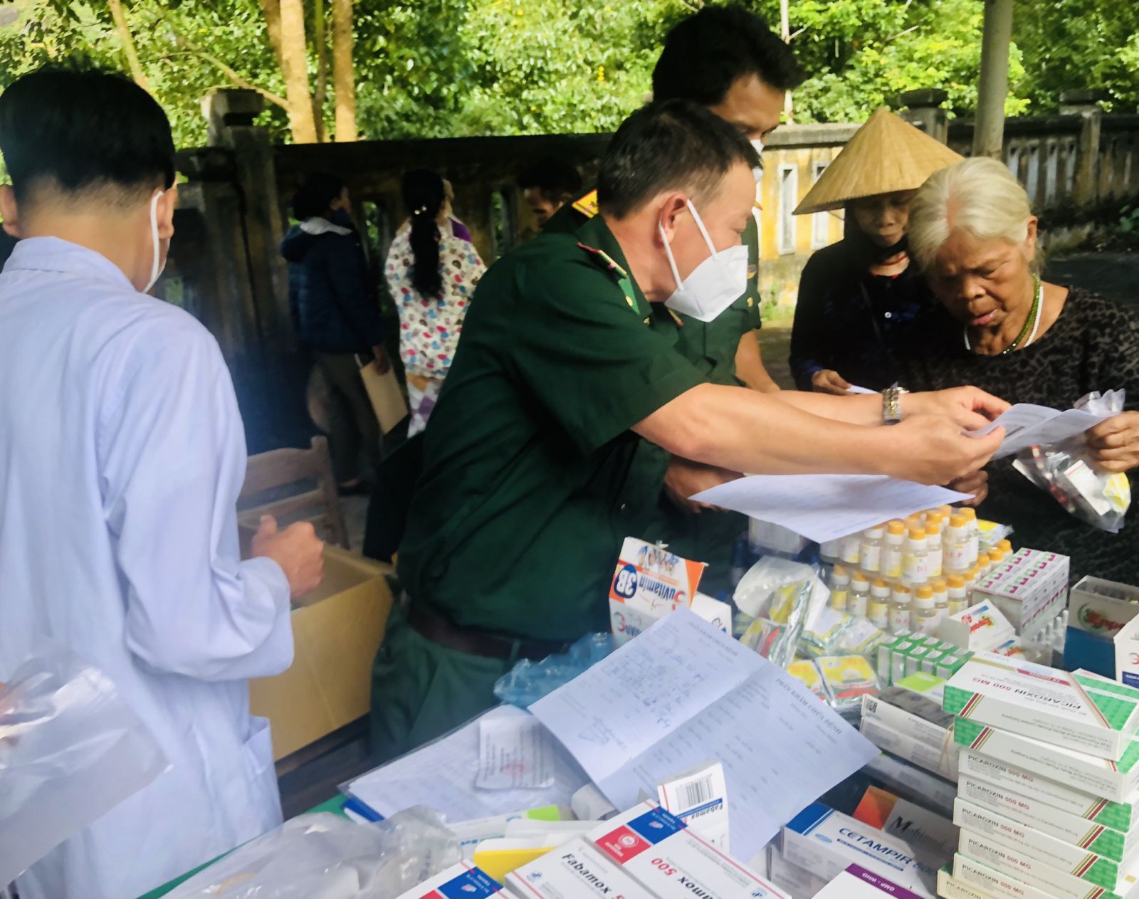 HNN.VN - Ngày 21/7, Đồn Biên phòng cửa khẩu Hồng Vân phối hợp tham gia cùng UBND xã Trung Sơn (A Lưới), Bệnh viện quân y 268 và Đoàn KTQP 92, Quân khu 4 phát quà, khám và cấp phát thuốc miễn phí cho bà con Nhân dân xã Trung Sơn.