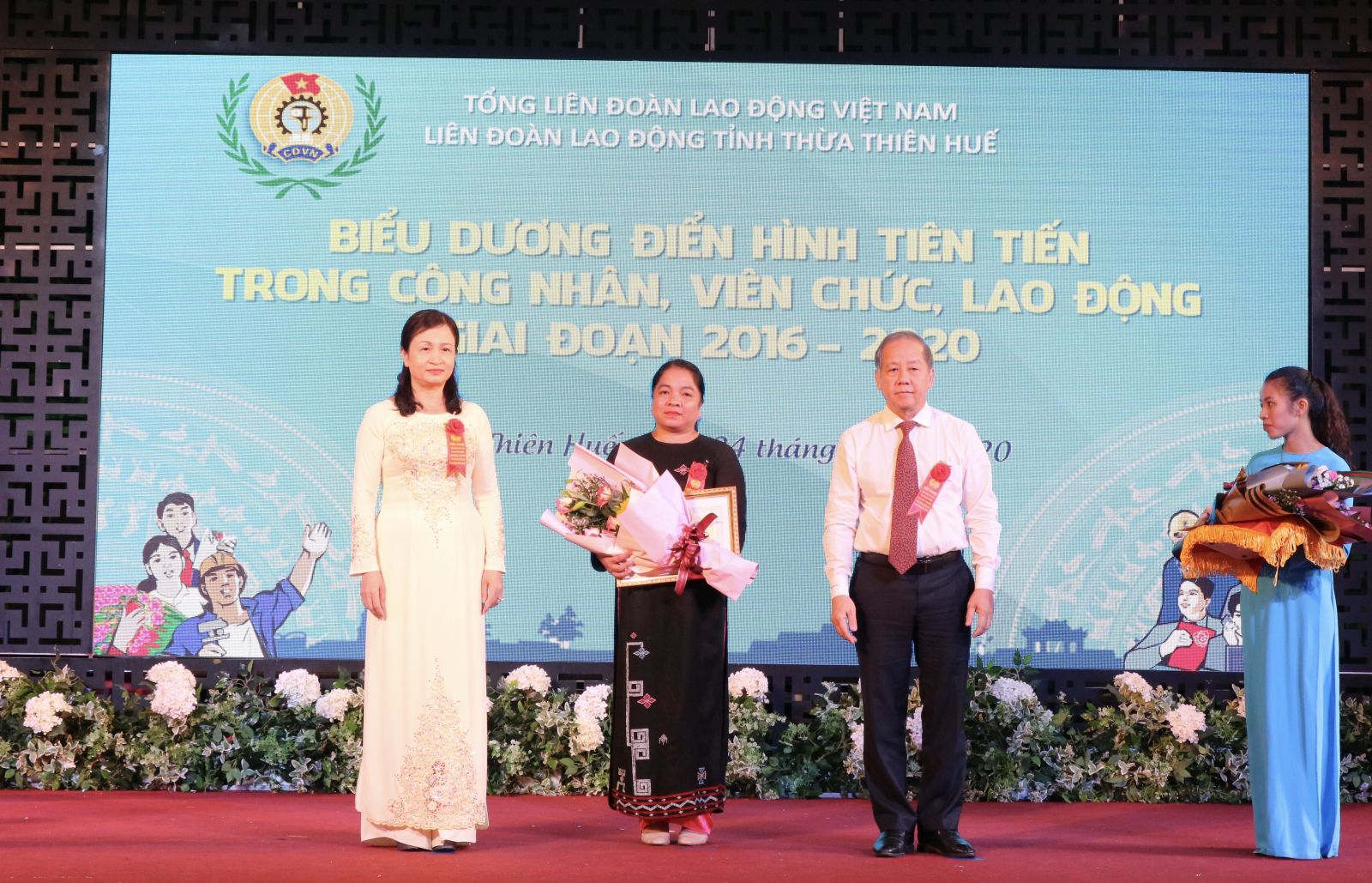Chủ tịch UBND tỉnh Phan Ngọc Thọ và Chủ tịch LĐLĐ tỉnh Nguyễn Khoa Hoài Hương trao bằng khen cho tập thể điển hình tiên tiến